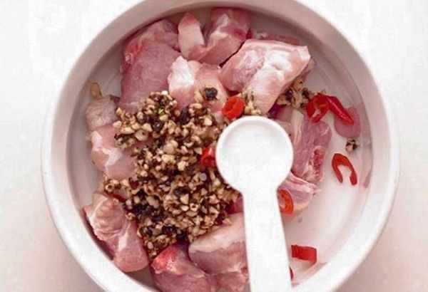 Step3.排骨加入蒜蓉豆豉、指天椒碎、砂糖、盐、麻油、油和生粉拌匀。