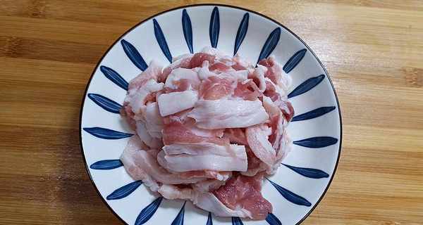 【第一步】:五花肉去皮,切成一元钱左右的薄片,装盘待用。