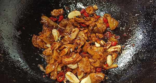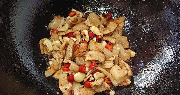 【第四步】:将五花肉炒至微黄,加入蒜头、豆瓣酱、豆豉和辣小米,炒香。