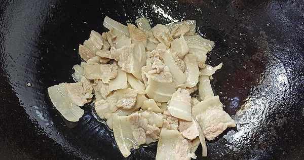 【步骤3】:炒锅放少许油,将五花肉倒入锅中,用中小火将五花肉的肥肉煎熟。
