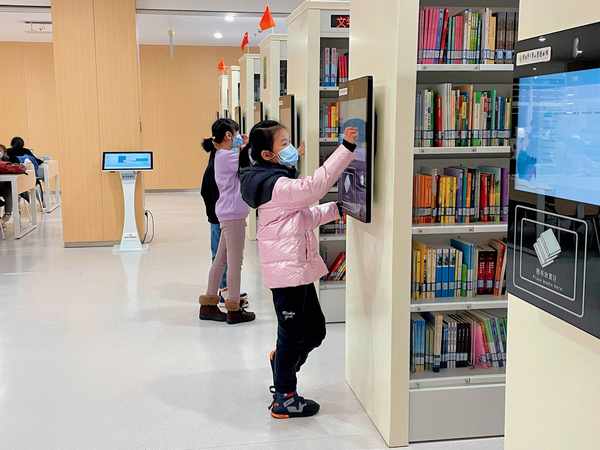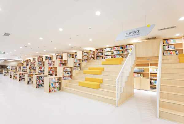 少儿馆共五层,主要功能分区有亲子阅览区,亲子教育区,外文区,国学馆,文学区,自然科学区,地图屋等。本馆采用了RFID技术,提供了瀑布流电子屏、朗读亭、少儿故事一体机、书法机等阅读新设备。
