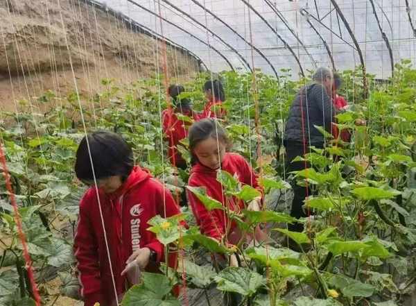 进行完植树活动,同学们到当地的黄瓜种植大棚观光、采摘,继续体验劳动的乐趣。
