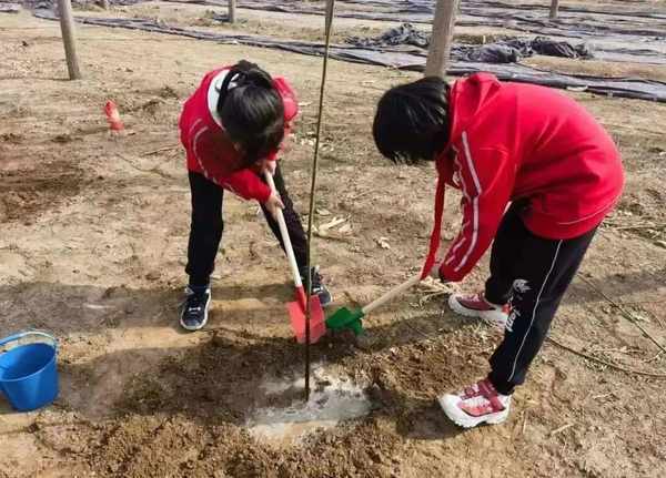 在植树节即将到来之际,孩子们在春天种下一棵希望的树苗,体验劳动快乐的同时,为环境保护增添一份力。大家动手挖坑、栽苗、固土、浇水,制作创意名牌,给小树苗起一个专属的名字播种下希望,在增强团队协同合作意识的同时,强化保护自然、尊重自然的生态文明理念。