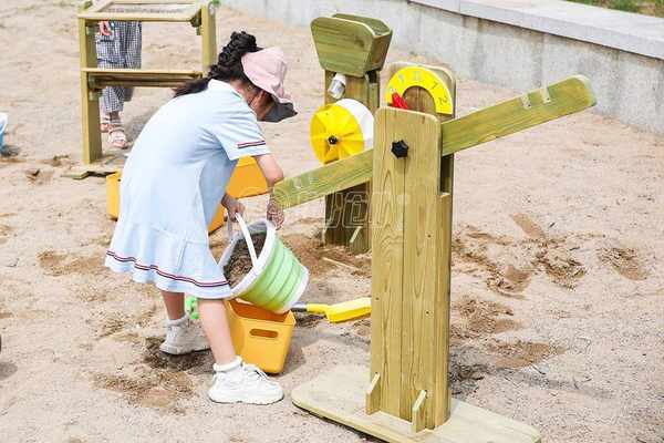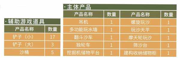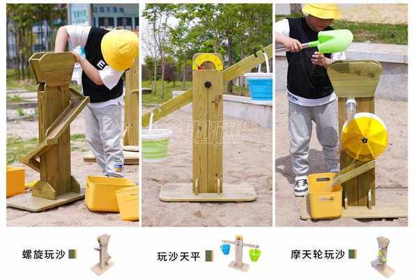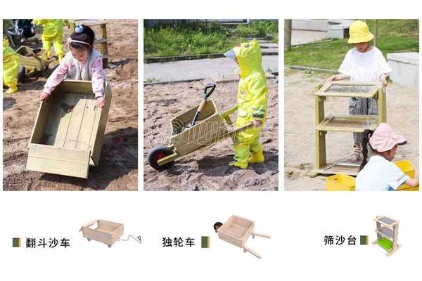翻斗沙车是收纳沙子的翻斗游戏车,拉动把手可以快速清空沙子;独轮车负责把沙子运往目的地;筛沙台通过晃动绳网来筛出沙子,以便区分出沙子的粗细。