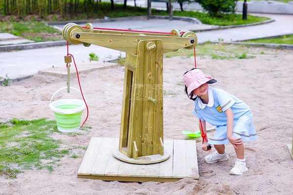 我们仿造真实吊机的造型,以进口北欧赤松为主体,打造出「旋转吊机」这个游戏平台,让孩子们通过控制绳索和吊臂提起挖沙桶,变身小小工程师。