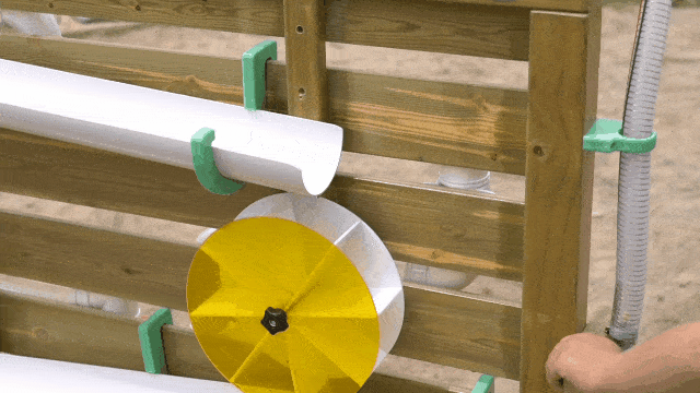 孩子们操作手摇泵将水送入顶部透明储水管中,并通过尾部的两个水龙头,分别将水分流到前端的瀑布式水路和后端的封闭管道式水路中。