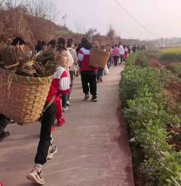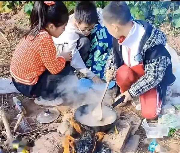 最近一条新闻上了热搜,那就是在四川资阳安岳县华阳九年制学校,他们带着孩子春游,可不只是带着零食,坐着大巴车去公园玩。他们可是正儿八经地春游——带着锅碗瓢盆,蔬菜和大米,步行来到田野里。