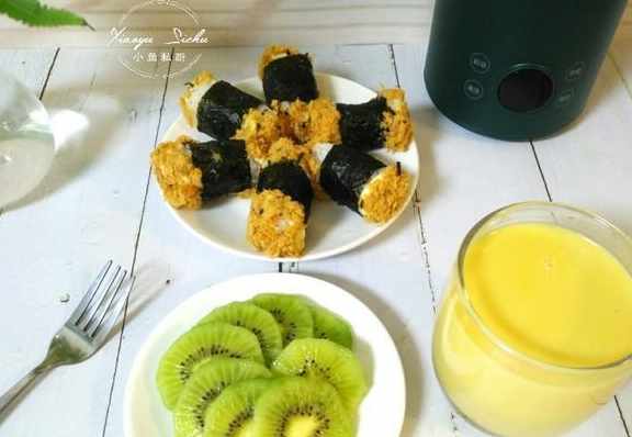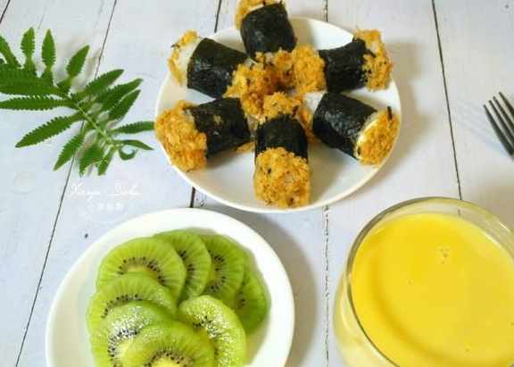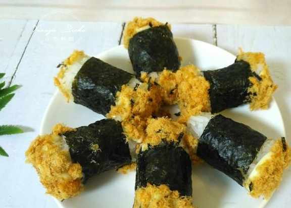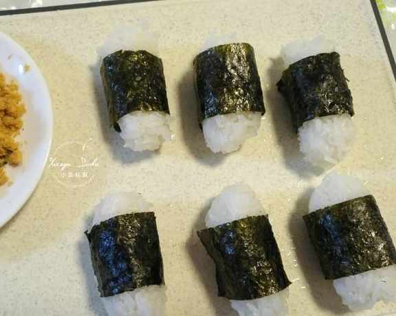 女兒很喜歡吃壽司,我休息在家時,就會提前做些肉鬆備著,早餐做幾個肉鬆壽司,簡單好吃又有營養。如果吃膩了,變化一下口味,再加點黃瓜,雞蛋卷成壽司,孩子也喜歡。
