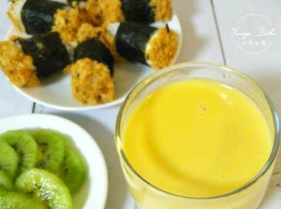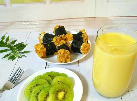 今天的早餐有肉松壽司、紅薯豆漿和奇異果。每年的八月到九月,是奇異果大量上市的季節,大街小巷都有,去年這個時候10元一斤,今年的奇異果比較便宜,才5元一斤,算起來一個只要一元錢,所以我只要碰到了都會買一箱回來,慢慢吃。奇異果富含維他命C,氣味芬芳又酸甜開胃,吃兩片奇異果再吃早餐,孩子胃口好,不挑食。