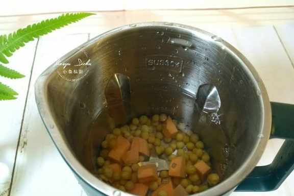 2,把黃豆和紅薯一起放入豆漿機中,加入適量清水,蓋上蓋子,啟動程式。