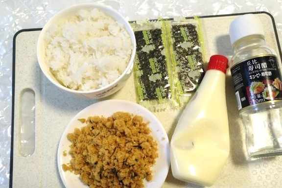 食材:米飯1碗海苔6片肉鬆30克沙拉醬(適量)壽司醋1勺