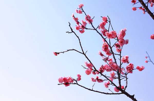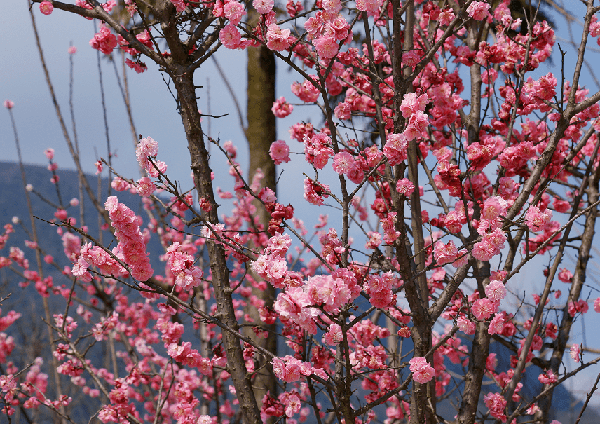 踩着石阶,穿过树林,越过小山包,登上寨子山顶,呼吸清新空气。令人惊喜的是,眼前的场景与秋天来时大不相同,秋日这里金黄遍野,处处是盛放的金丝皇菊,而如今,金丝皇菊进入“休息期”,正蓄力在今年秋天展现魅力。不远处连片的梅花拿着接力棒尽情绽放,2000余株的梅花因品种不同,会次第绽放,花期也将持续到4月初。
