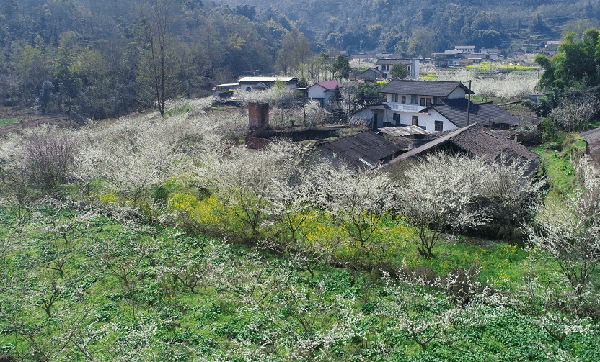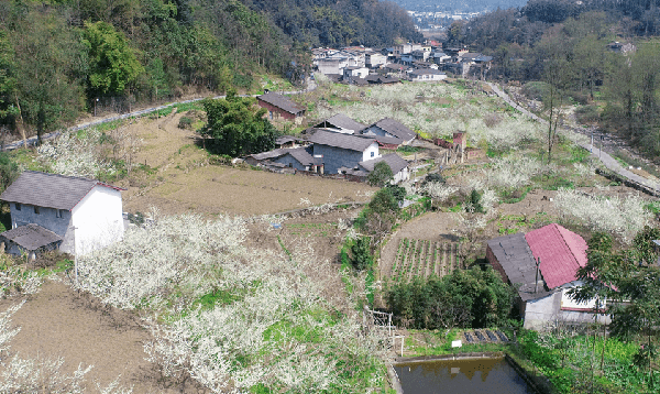 山脚处,是白的像雪的李花,紧密挨着的李树沐浴着阳光,朵朵李花绽放枝头,与流水、屋舍构成了一幅独具烟火气的春日美图。闭上眼睛,耳边溪水潺潺声,鼻尖萦绕花朵清香。