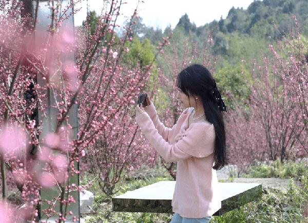 迈着轻快的步伐穿梭在梅花小道上,一旁造型各异的奇石、古色古香的小亭子都是一张张美图里“绝美道具”。累了可以在观景平台看铁路上过往的火车,渴了可以泡上一杯金丝皇菊茶,饿了可以品尝当地农家饭。