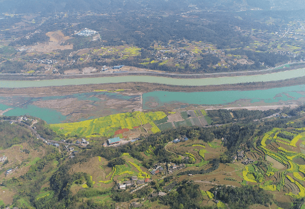开始攀登寨子山,满眼绿意止不住,树上偶尔蹿出几只小鸟,鸣啼几声后飞过,好似欢迎前来游玩的人们。来到半山腰回头望去,大渡河旁一大片油菜花好似一块块金色蛋糕拼接在一起,让人忍不住将这景象定格在手机里,心里还默默记下下山后一定要去花海边走一遭。