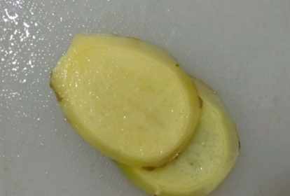 第二步,香葱摘洗乾淨後,控幹水,將香葱挽成葱結,生薑一小塊切成片,在鍋中添上水,放入葱結和薑片,同時加上一點點食鹽和少許的料酒;
