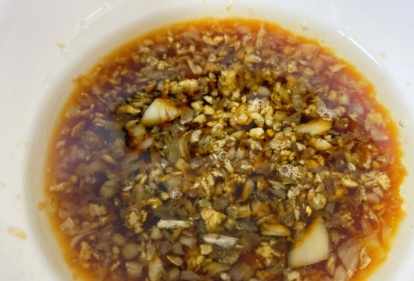 第四步,接下來準備料汁,生薑、大蒜切成末,放入在一個小碗中,加上一點點香醋、白糖和少許的醬油,攪拌均勻,料汁便做好了;