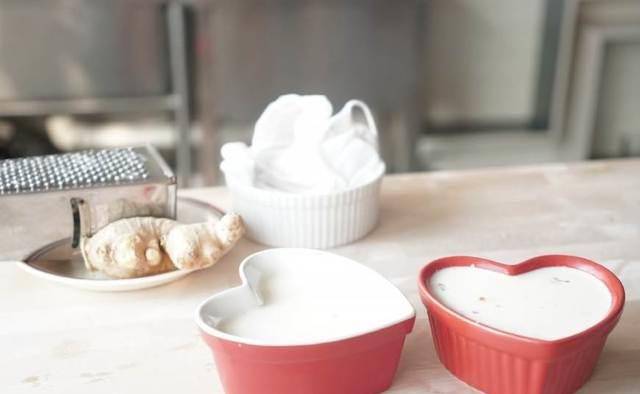 Step1.磨姜取汁后,每碗放入2汤匙姜汁。Step2.牛奶加黄糖煮至80度。