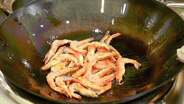 将油锅加入锅中。油温五成热时,将处理好的鲜虾放入锅中,用小火慢慢煎虾油。煎3分钟左右,翻面煎另一面。