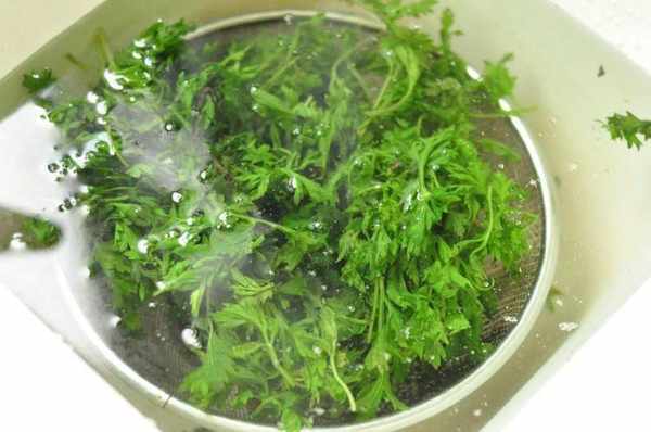 2在沸水中加入小苏打,将艾草焯水,立即放入冷水中,防止变黑。