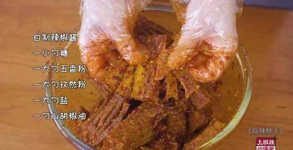 香干里加入刚才炒好的辣椒酱,再加入1小勺糖、1大勺五香粉、1大勺孜然粉、1大勺盐,有条件的可以淋入1勺山胡椒油,用手翻拌均匀,让每一片都裹满酱料。