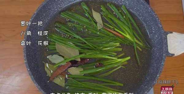 先来炸个葱油,放入葱段,来点八角、桂皮、香叶、花椒、这些香料,用小火熬干,把香料全部捞出来,这样熬出来的油特别香。