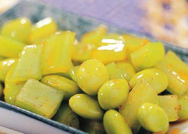 制作步骤:1 、芥菜嫩茎洗净,切成小丁;蚕豆瓣放入沸水锅中煮透,捞出过凉。
