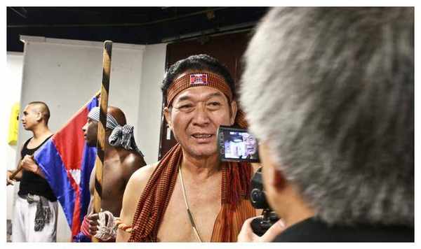 在狮拳的对抗法则中,赢得最后的胜利是最重要的目标。就像这样,在狮斗拳中,不仅有一套赤手空拳的格斗拳法,还有带武器装备的武术,涉及近身格斗、地面技术和武器使用等高棉武术形式。掌棍、长棍、腰带、丝巾等物品都可以作为格斗中的武器,甚至可以将石头包裹在腰带中攻击对手。 在吴哥王朝时期,狮斗拳独特的拳法帮助士兵赢得了许多战斗。但随着时间的推移,王朝的更迭,以及柬埔寨历史上某些时期对狮斗的打压,使得这种曾经风靡一时的传统拳种几乎失传。 拿起,高举 “我希望吴哥窟石墙上的东西回归柬埔寨人民的生活。”被誉为现代醒狮拳之父的SanKimSean,自柬埔寨社会环境趋于稳定以来,一直致力于“捡拾”醒狮拳这一古老拳法并将其推向大众视野和世界舞台的工作。