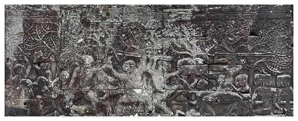 吴哥窟巴戎寺入口处的柱子底部有许多描绘狮斗拳各种技法的浅浮雕。其中一幅浮雕展示了两个男人之间的格斗对抗,另一幅展示了两个士兵用肘部攻击的场景,这两幅浮雕都展示了现代柬埔寨拳击和自由搏击的标准技术。其他与狮斗拳有关的浮雕画也描绘了一个男人面对一条攻击他的眼镜蛇并与一只大型动物搏斗。 斗狮拳最初是为了对抗自然界的野兽而形成的。所谓“知己知彼,百战不殆”,但斗狮拳其实源于自然,模仿动物动作。人们不仅通过观察凶猛的狮、虎、鹰发展出了一套相应的拳法,蚱蜢、猴子甚至鸭子都可以借鉴。狮斗拳总共包括10,000多个动作。
