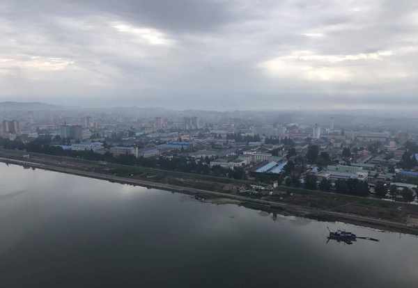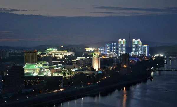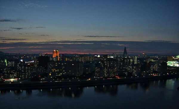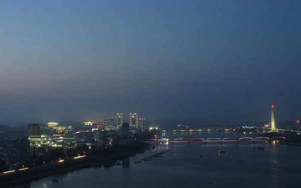 朋友睡不着,下半夜的时候,透过窗户向外望去,夜幕之下的大同江显得格外静谧与神秘,远处的柳京饭店幕墙散发着耀眼的光芒,为这漆黑的平壤带来了一丝曙光,还有主题思想塔也有灯光亮起,导游后来说:这些建筑物是彻夜亮灯的!