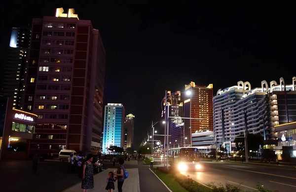 我们游客来到国外首都平壤,想要领略平壤的夜色并不难,但看到的并不全面,游客们在晚饭之后,可以跟导游商量出去溜达,一般会去羊角岛酒店周边,或者是仓田街、黎明街、未来科学家大街,这几处街景自然是非同寻常,或许是因为经常有我们游客的光顾,看起来霓虹闪烁,通火通明,一副繁荣富强的模样,但是,导游会催促九点之前就要回来,不能在外面呆的太晚,据说:这些地方在晚上10点半之后就会关灯,好像是专门方便外国游客夜游安排的亮灯时间!