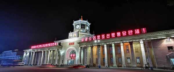 乘坐火车去国外,上午10点,火车从辽宁丹东火车站出发,短短几分钟抵达新义州火车站,在此进行2小时左右的安检,12点换乘另一辆火车再度出发,新义州距离平壤只有220公里的路程,但以平均时速50迈的速度走了大概5个多小时,晚上6点左右,火车终于抵达平壤火车站,此时,天已见黑,但游客们的精神头却很足!