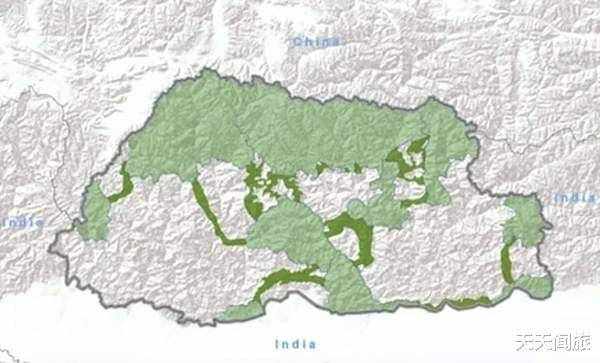 通过持之以恒地植树,将各大保护区连接起来以后的不丹森林版图