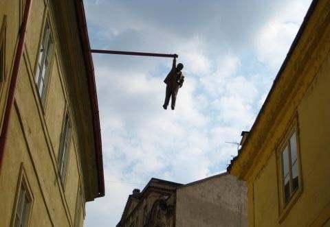 令人惊奇的是,在布拉格的街头抬头仰望时,你会突然发现一个中年男子用手抓着探出屋顶的钢管,另一只手却插进口袋里,仿佛没事人一样。第一次看到这种情况的游客都会有些不淡定,第一时间只会想着报案救人,随后当他们知道真相之后却会忍俊不禁,感觉非常有趣。