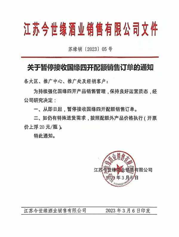 3月6日,今世缘酒业发布消息,从即日起暂停接收国缘四开配额销售订单。这也使得国缘四开作为今世缘酒业的超级大单品,受到了来自行业和渠道的更多关注。