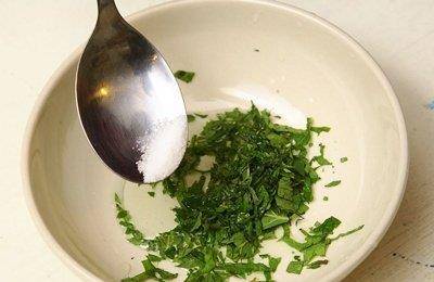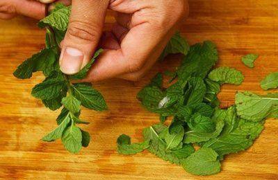 Step2:薄荷清洗后,用手将薄荷叶从梗上拔下,再以菜刀将薄荷叶切至细碎状。Tips:切薄荷叶时,可将薄荷叶多片叠在一起,卷起后再切,切的速度较快也比较方便。