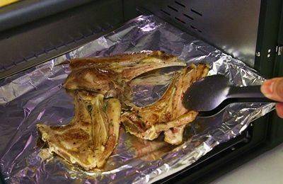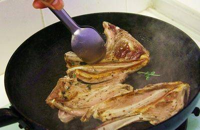 Step4:起锅开中火,倒入少许橄榄油,将羊肩排两面煎熟,并加上白酒20c.c.,即可关火,约2分钟。Tips:若不喜欢羊肉的腥味,白酒有去腥作用,可在香煎时加入。