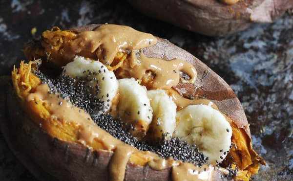 要吃的时候,再将地瓜切成小块状,撒上少许海盐,再淋上杏仁黄油、奇亚籽,再摆上香蕉片,最后撒上肉桂粉即可。