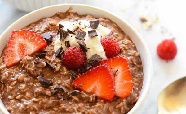 先将燕麦片、可可粉、奇亚籽和盐先均匀搅拌在碗中。然后添加希腊酸奶、无糖杏仁、枫糖浆、香草精再次搅拌。