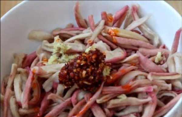 吸干水分的萝卜条放入大碗中,加一些姜末,辣椒油,用手抓匀就可以了,当然你也可以放自己爱吃的调料,抓匀之后我们给它放到保鲜盒中,吃的时候再拿出来,平时放在冰箱冷藏储存,非常的简单方便,萝卜条这样做香辣可口非常的脆爽简单易做易储存,这样做好之后半年都不会坏。