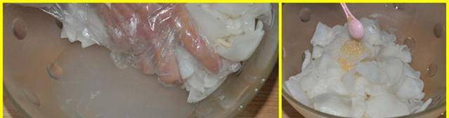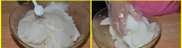 萝卜片置于容器铺撒两小匙盐,轻柔抓匀后静置几分钟以待释出水分。