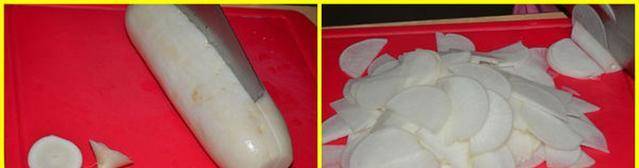 萝卜无需去皮,刷洗干净后先去头尾、直剖再切成薄片。(他买萝卜时便以粗细一致为挑选准则之一,因此好切。刀工要讲究,太厚则口感逊色。)