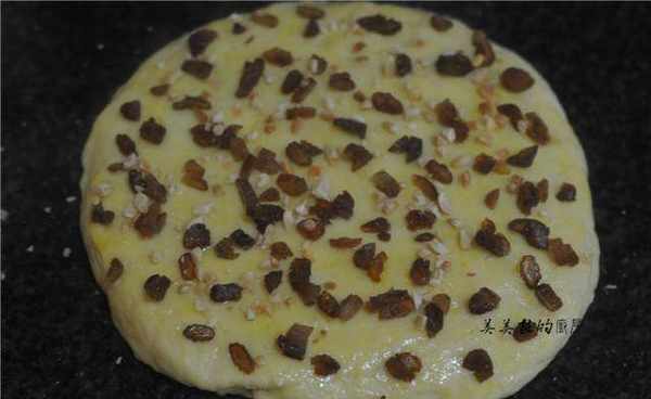 在面皮上铺上葡萄干,用手轻轻按一下,使葡萄干和面团贴合,防止烤的时候脱落。撒上之前预留的酥粒。