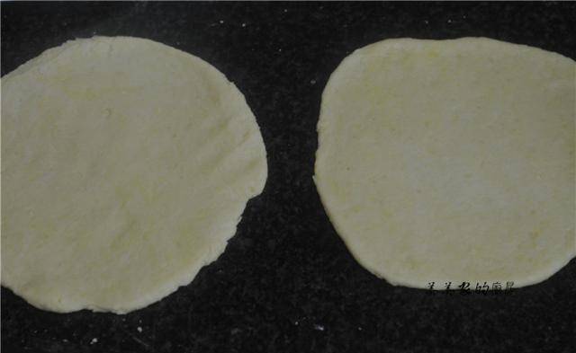 将揉好的面团分成两份,用擀面杖擀成饼,厚度大概0.5cm就好了。