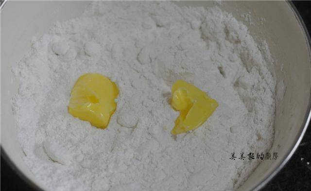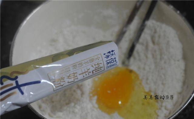 加入打散的鸡蛋液(鸡蛋液留一点最后的时候刷表面用),继续抓匀抓松。挤入羊奶粉,留一小把抓好的粉出来备用,最后做酥顶用。
