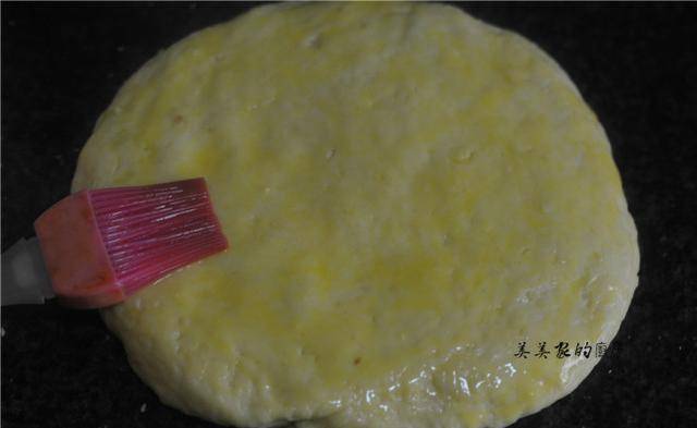 将另一块按扁按圆的面团覆盖在上面,上下两块面团边缘接口处捏紧。刷上预留的鸡蛋液。