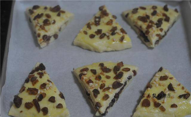 如果顶上撒葡萄干的话,建议葡萄干提前用水或朗姆酒泡一下再用,因为葡萄干本身太干的话烤完可能容易糊,我的就糊了,所以后面我将葡萄干都抠掉了哈哈。