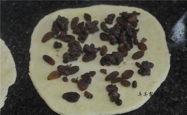 在其中一份按扁的面团上均匀铺上红蜜豆喝葡萄干。铺好了轻轻按压一下,让蜜豆和面团贴合。