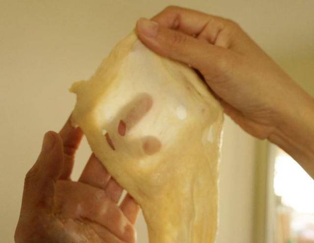 有一阵子免揉面包很风行,强调完全不需揉面,把面包的制程简化到最少,我自己试过的感想是如果做材料单纯的硬式欧包,免揉不失为一个偷吃步的好方法,但我觉得如果想做出松软蓬松会长大的软面包,拉出透光的薄膜是重要的关键,所以揉面过程在所难免,不过只有短短几分钟的手工是值得付出的
