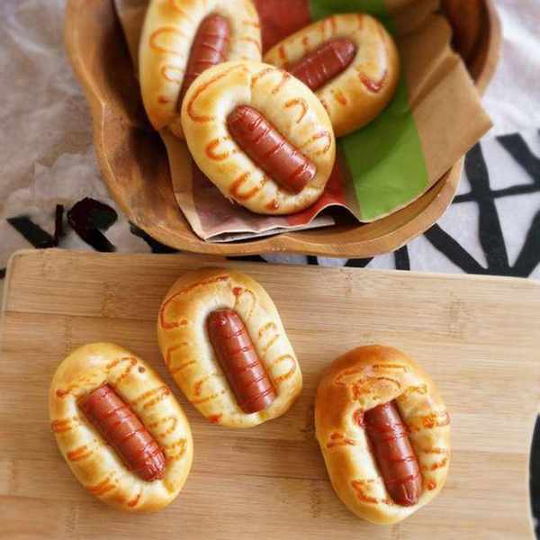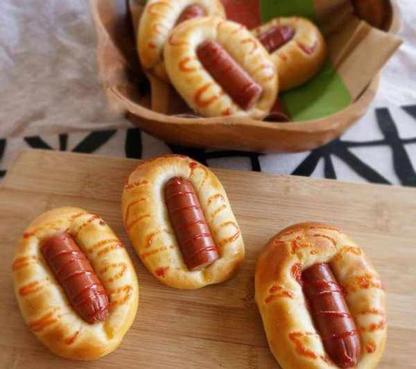 表面装饰材料:热狗5根切对半,番茄酱少许